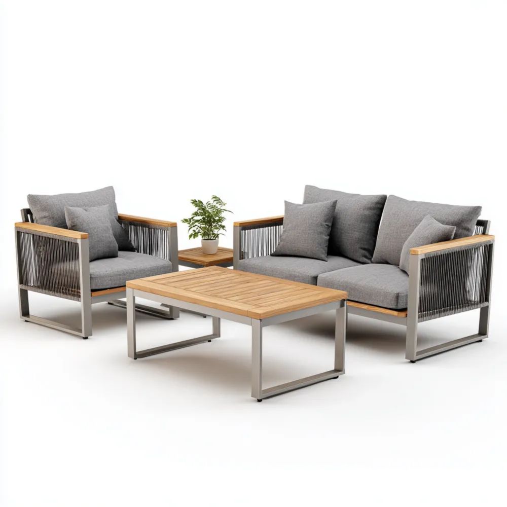 Materiali e lavorazioneIl set è composto da una struttura in alluminio resistente e dettagli in legno di qualità. I cuscini sono rivestiti in tessuto grigio elegante e durevole, ideale per l'uso esterno.