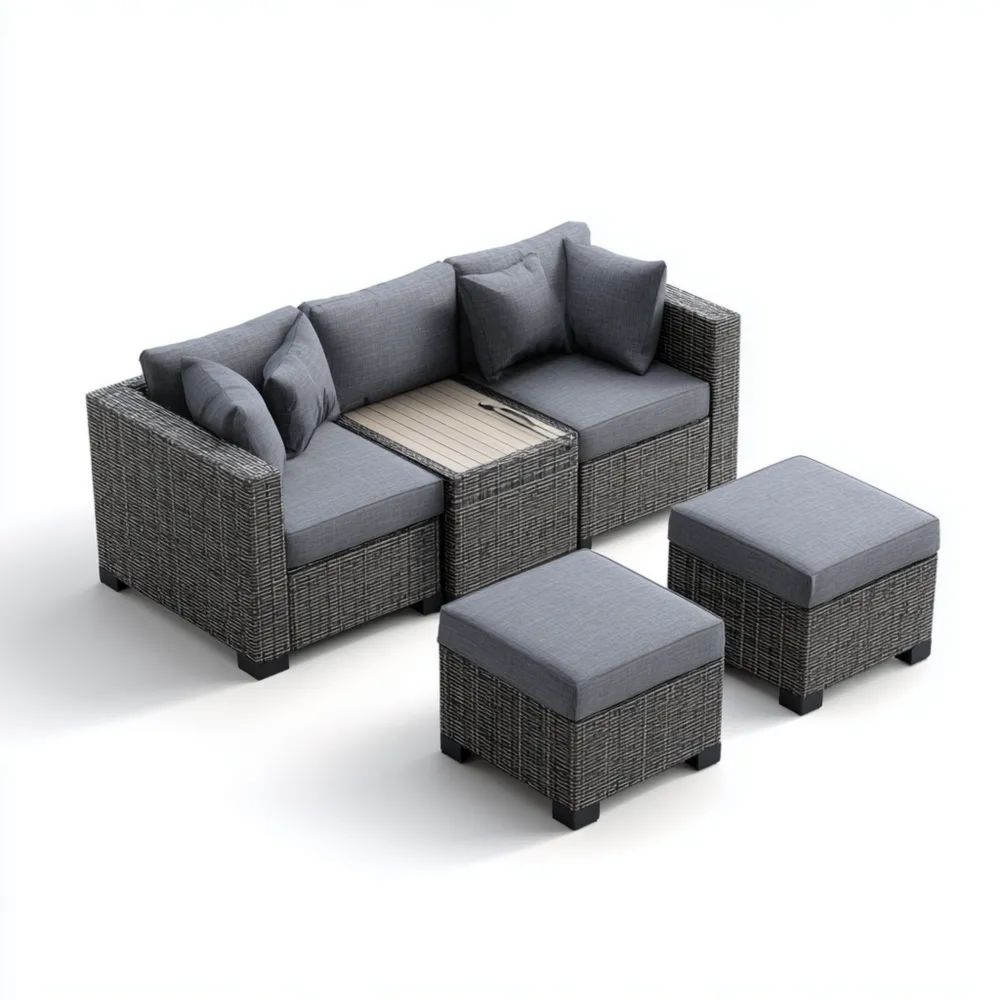 Funzionalità PrincipaliIl set include due comode poltrone e due pouf che possono essere utilizzati come sedute extra o poggiapiedi. Il tavolino centrale è ideale per poggiare bevande o snack.