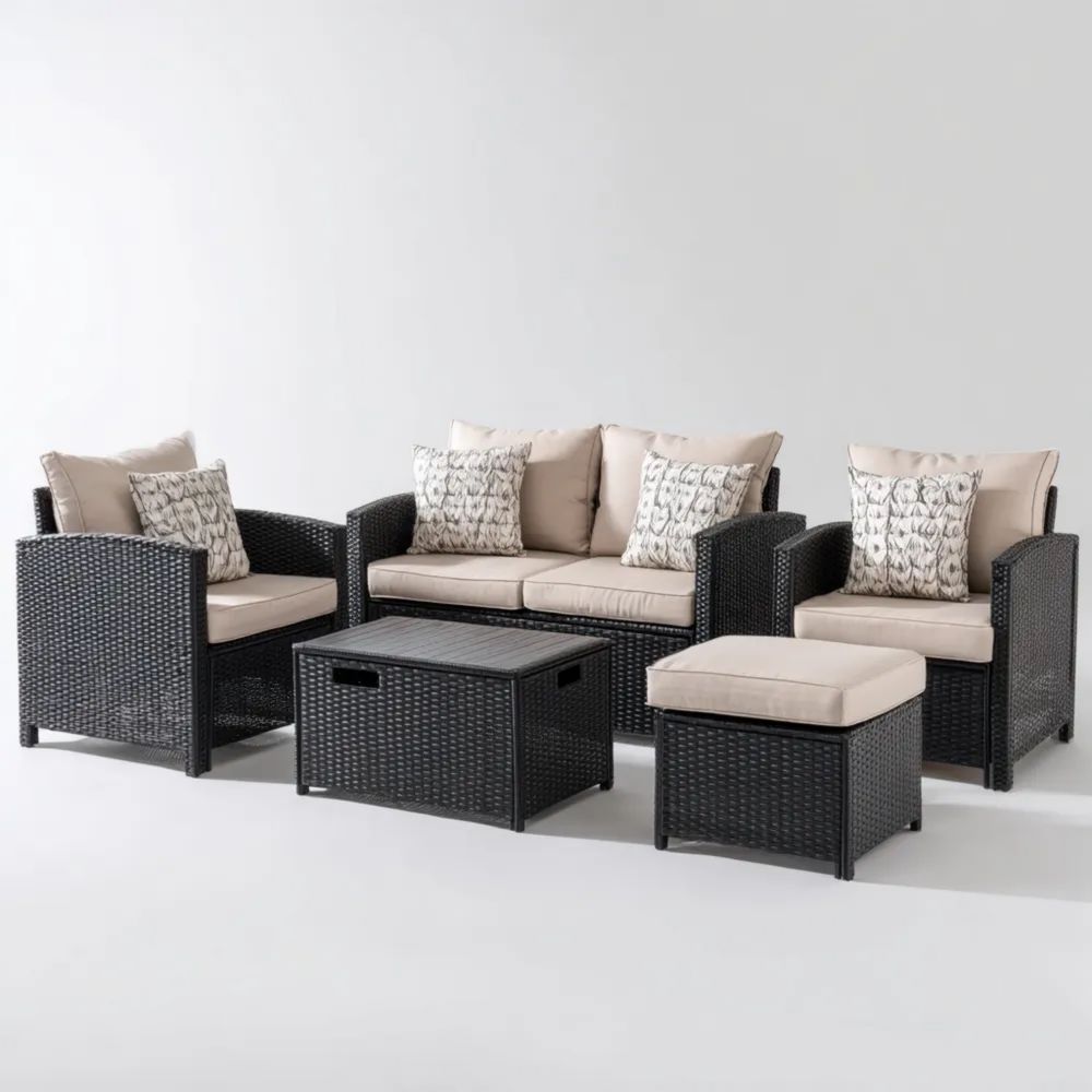 Funzionalità e vantaggiIl set include un divano a due posti, due poltrone, un tavolino e un poggiapiedi, offrendo ampio spazio per intrattenere ospiti o rilassarsi. I cuscini spessi garantiscono massimo comfort.